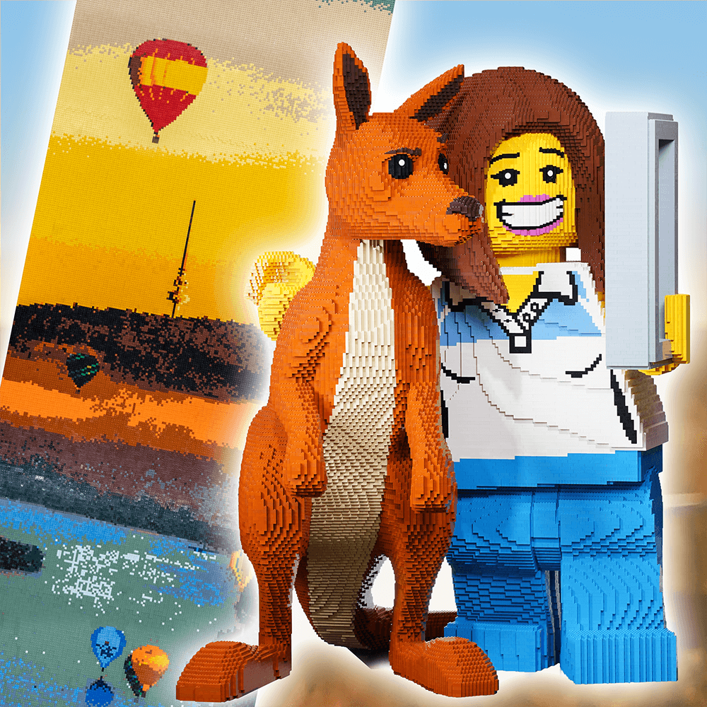For this store we chose to create our minifig posing for a selfie with a giant LEGO® brick Kangaroo!The biggest design challenge n this model was to create a kangaroo that LOOKED like a LEGO® animal, so our designer spent quite some time getting it right!We also decided to create a selfie image as a brick-built mosaic within the giant LEGO phone.As with all the LC stores around the country we also built a huge mosaic for the store- which of course had to be Canberra’s iconic Black Mountain complete with colourful hot air balloons! This mosaic is actually based on a photo by Erna Glassford, who gave us permission to turn her amazing photo into a LEGO mosaic. You can find more of their work on Instagram under @simplycheeckyIn the end our Kangaroo-Selfie minifig took us 394 hours to design and build with over 87,173 LEGO® bricks used in her construction! The Black Mountain mosaic took us a further 103 hours and 11,248 hours to build.